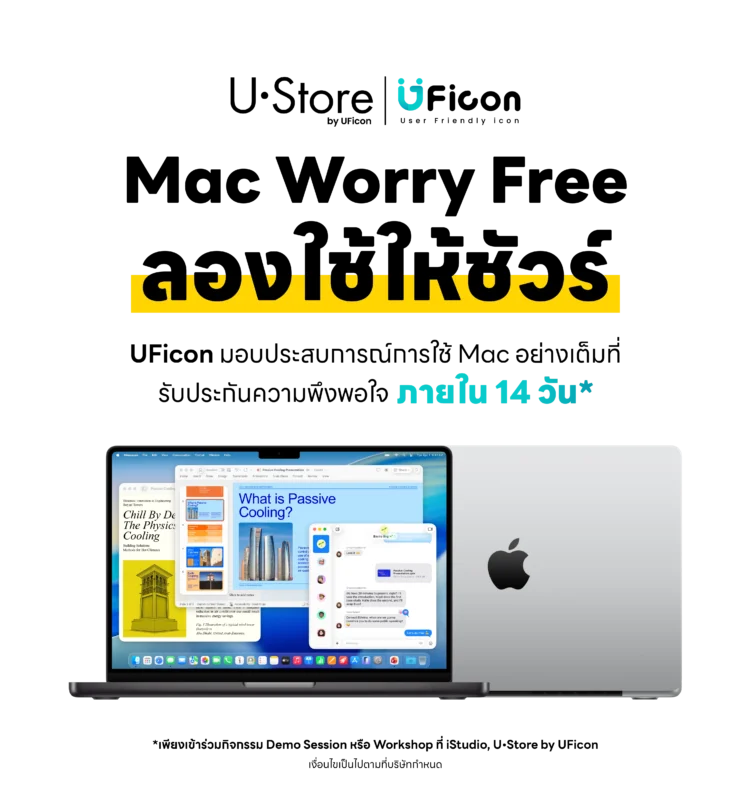 Mac Worry Free ลองใช้ให้ชัวร์ คือ โครงการที่เปิดโอกาสให้ผู้ที่สนใจซื้อสินค้าประเภท Macbook ได้รับสิทธิ์ในการ คืนสินค้าได้ภายใน 14 วันนับจากวันที่ซื้อ เพียงเข้าร่วมกิจกรรม Demo Session หรือ เข้าร่วมกิจกรรม Workshop จาก iStudio, U•Store by UFicon